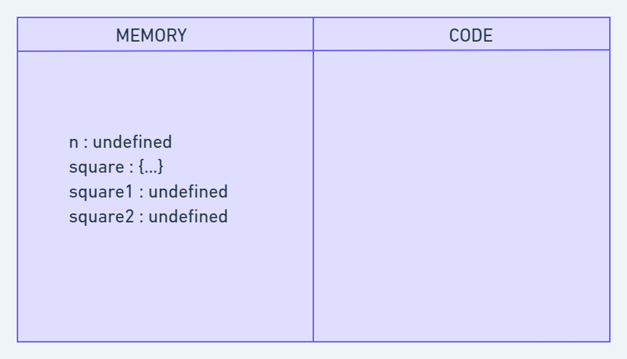 When it reaches the line where the square function is defined - a function that has already been allocated memory, it directly jumps to the line var square1 = square(n), and the square() function is called. The JavaScript engine will initialize this function once again.