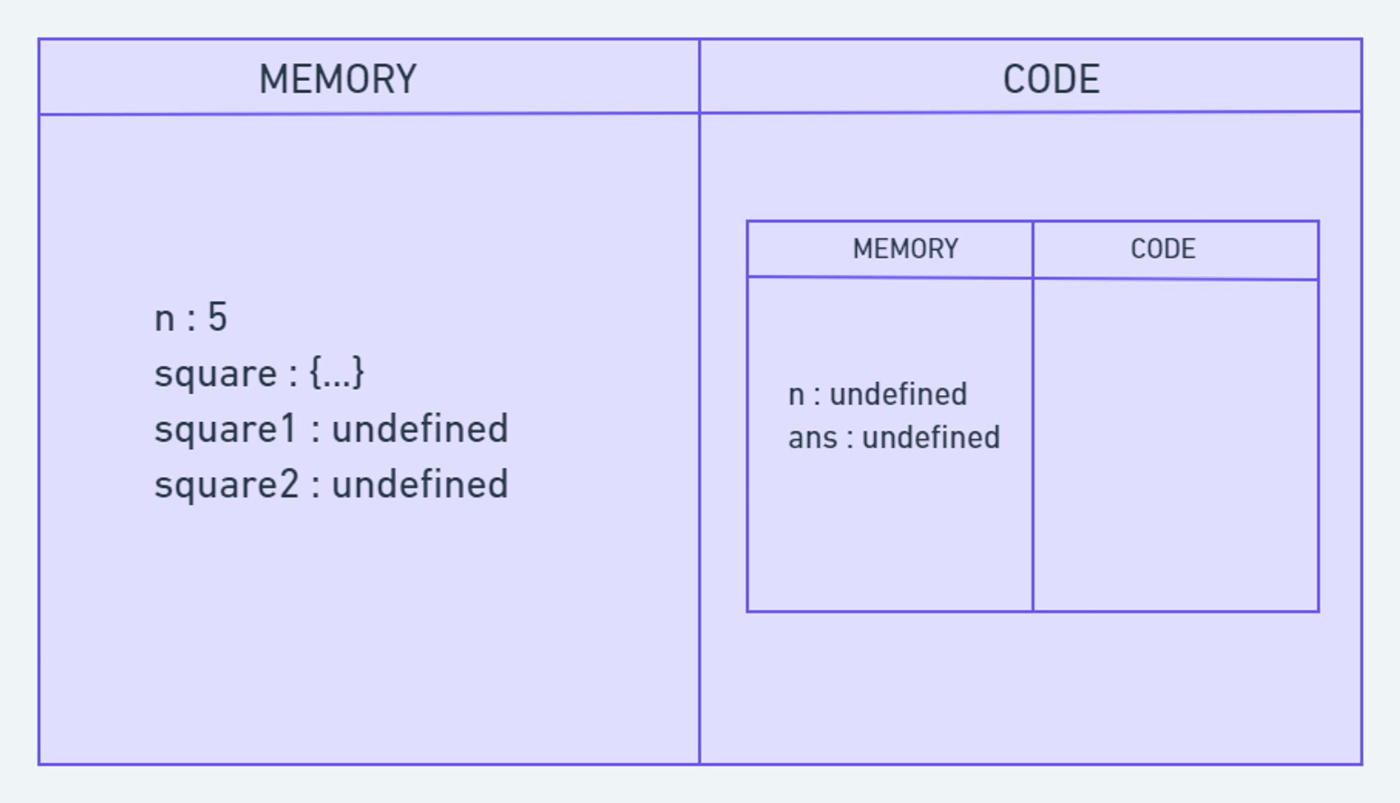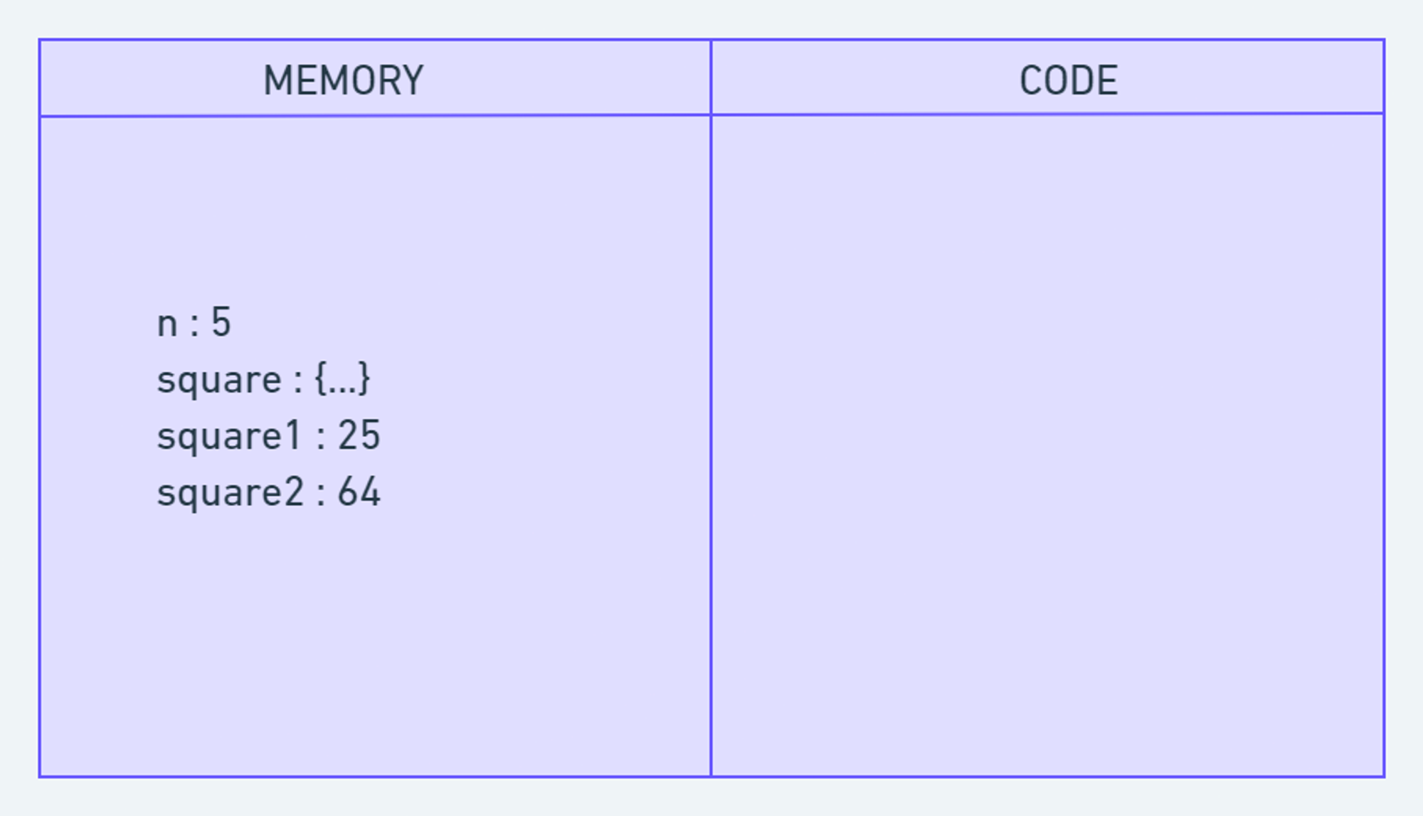 After the function executes and its return value is assigned to the variable square1, the function execution context will be destroyed. Once all the code has been executed, the execution context will appear as shown in the diagram below, and it will also be destroyed.