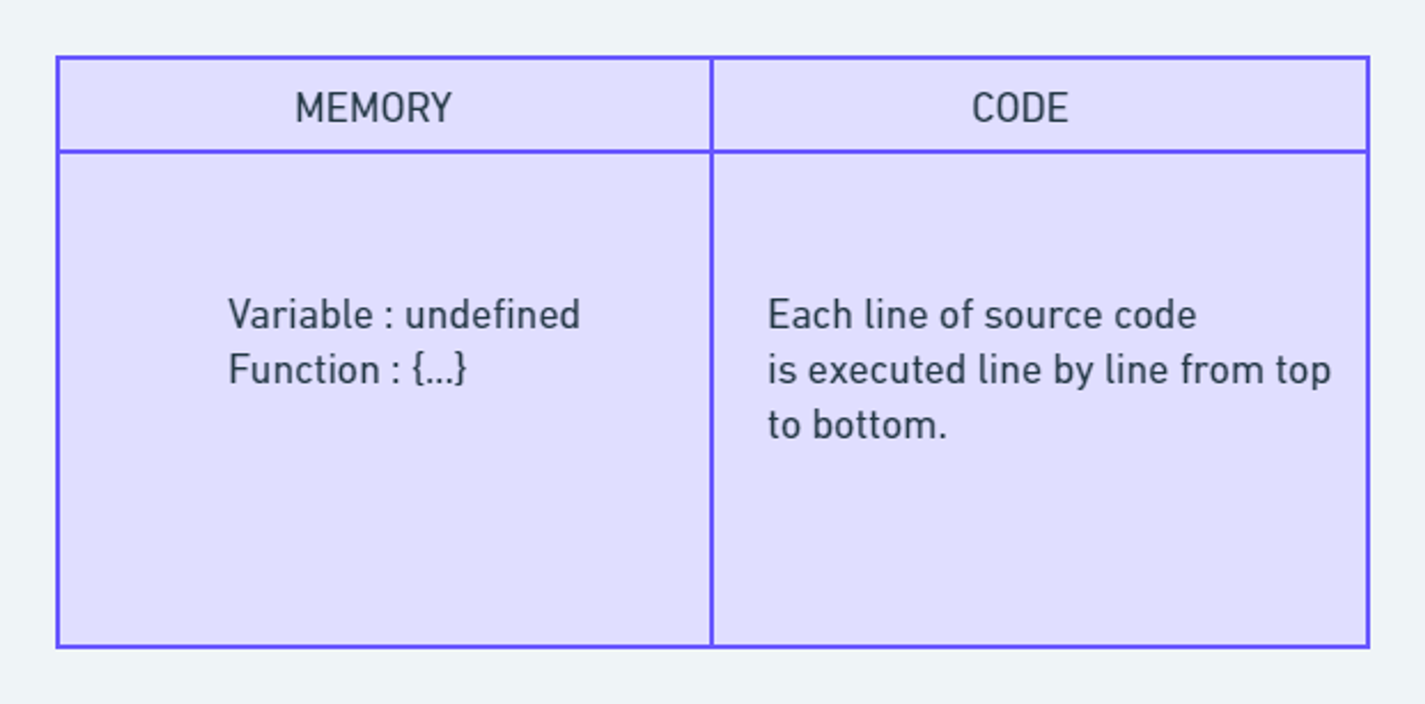 Everything in JavaScript happens within an execution context, which is divided into two parts: Memory and Code. Importantly, all components and phases apply to both global and functional contexts.