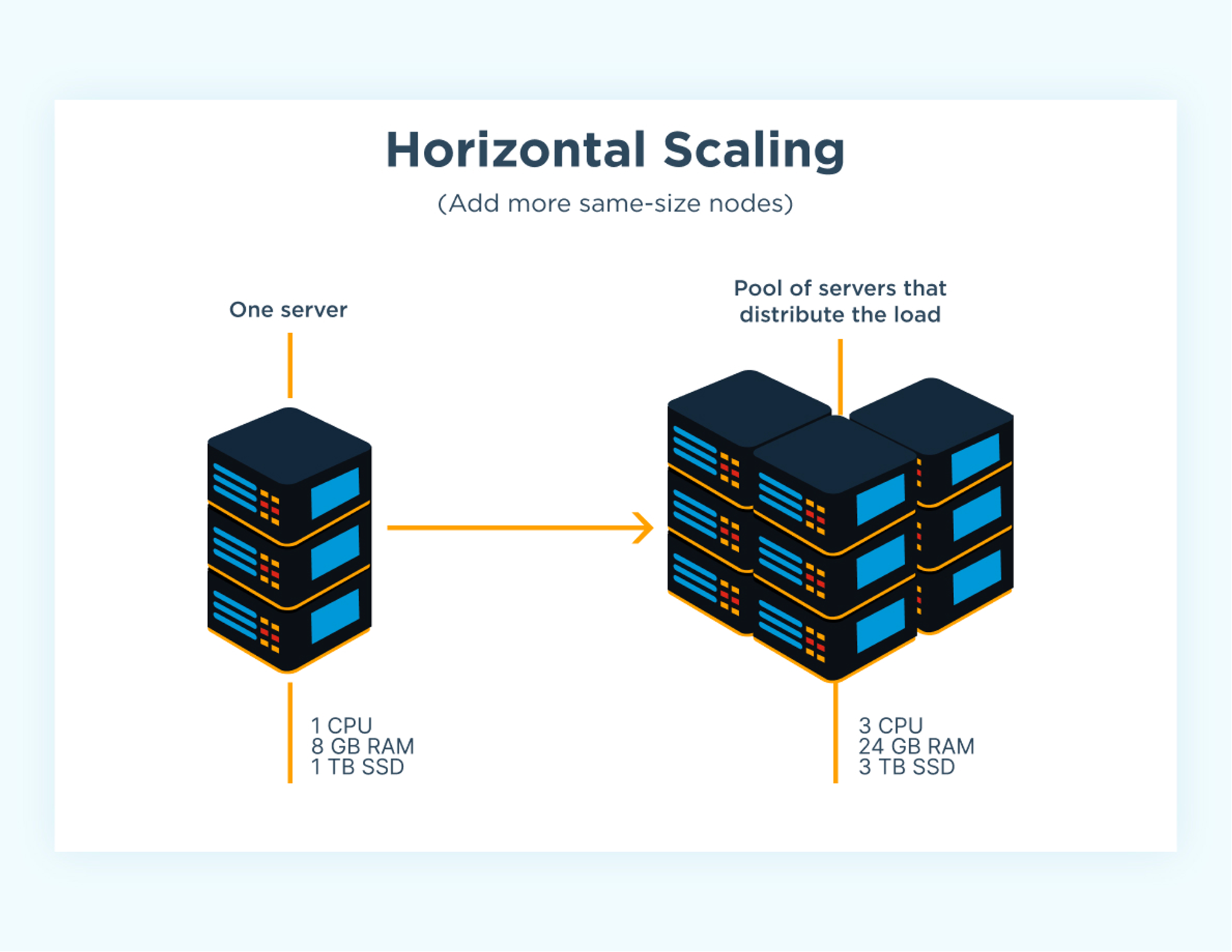 Horizontal scaling, also known as “scaling out,” involves expanding a system horizontally by increasing the number of nodes and machines in the resource pool. This allows a piece of logic to be processed concurrently across multiple devices by breaking down processing tasks into smaller parts for other machines to handle. Put simply, horizontal scaling is like hiring additional people to handle a group of problems or additional customers.